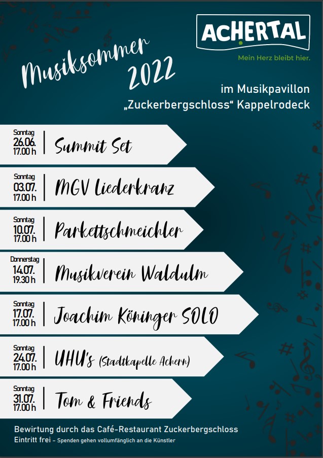 Endlich ist es wieder soweit! Unser nächster Auftritt findet am Sonntag, 26.06.2022 im Zuckerbergschloss in Kappelrodeck statt. Start ist um 17.00 Uhr. Geplantes Ende der Veranstaltung ist gegen 19.00 Uhr. Wir freuen uns auf Euch. Rock on!